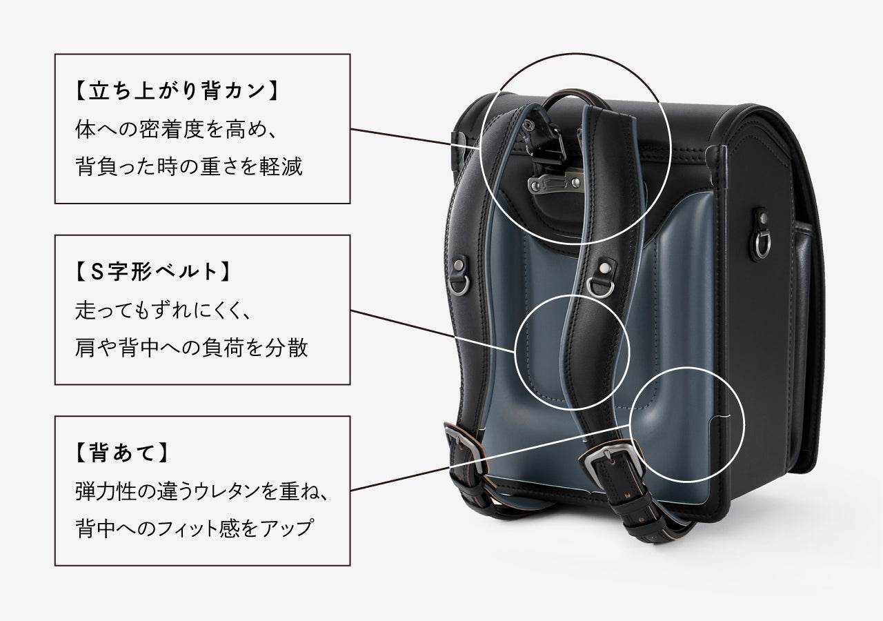 柔らかな「背あて」や「立ち上がり背カン」、「S字形の肩ベルト」など、体への負担を軽減するパーツを採用。鞄と背中の密着度を高め、軽く感じる設計に。