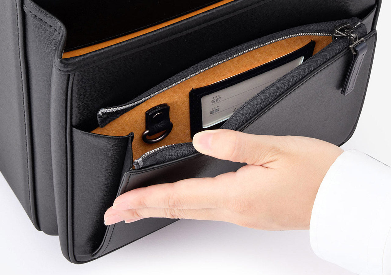 出し入れしやすく、容量も大きい前ポケット。ハンカチやティッシュ、雨カバーなどを入れるのに便利です。名前カードとキーフックは、防犯対策のため内側に装備。
