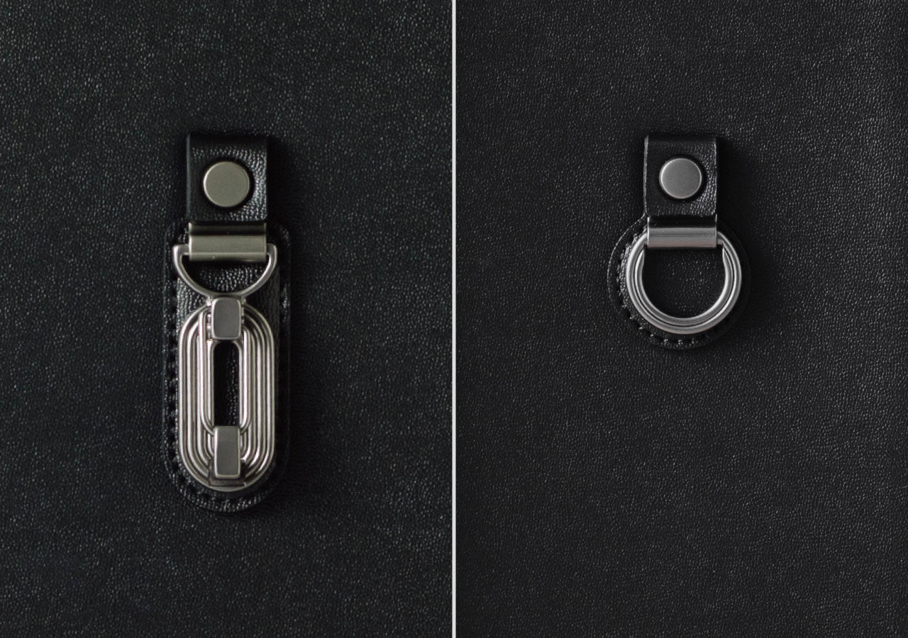 本体側面に加え、左右の肩ベルトにもDカンがついて、さらに使いやすくなりました。Dカンには防犯ブザーやリフレクターを、フック型のナスカンには巾着などよく取り外すものを。