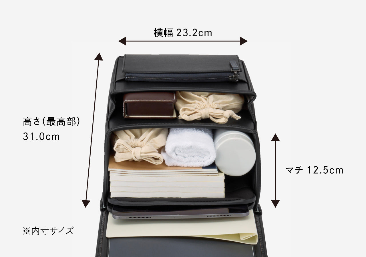 【中段ポケット】高さ:19.5cm 横幅:20.0cm~22.0cm(拡張時) マチ(奥行き):3.0cm~3.5cm(拡張時)
