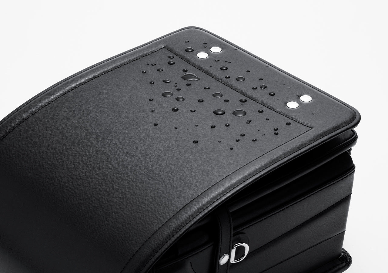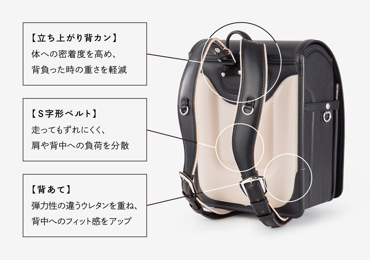 柔らかな「背あて」や「立ち上がり背カン」、「S字形の肩ベルト」など、体への負担を軽減するパーツを採用。鞄と背中の密着度を高め、軽く感じる設計に。