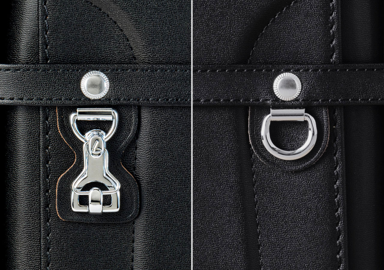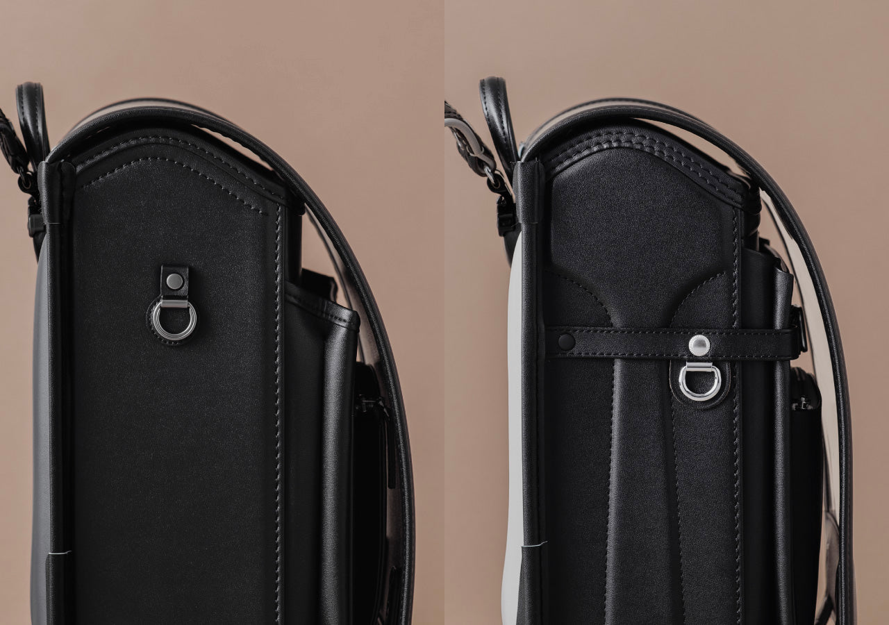 本体側面に加え、左右の肩ベルトにもDカンがついて、さらに使いやすくなりました。Dカンには防犯ブザーやリフレクターを、フック型のナスカンには巾着などよく取り外すものを。