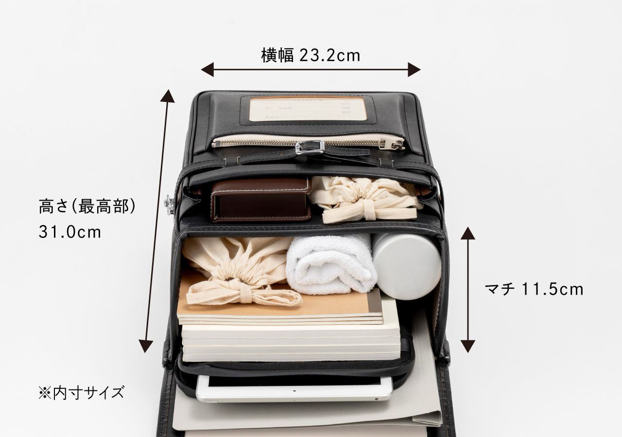 教材はもちろん、PC・タブレットやA4フラットファイル、給食袋まで入る安心の収納力です。