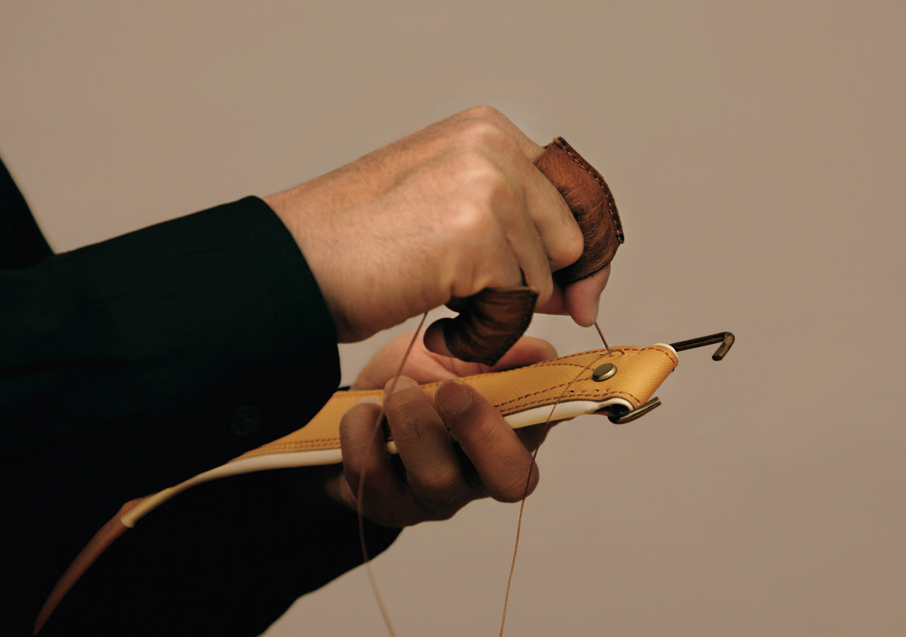 擦れやすい角は、花びらのようなひだを重ねて美しい仕上がりに。指革や美錠受けは革を二重にするなど、小さなパーツにまでひと手間を重ねています。