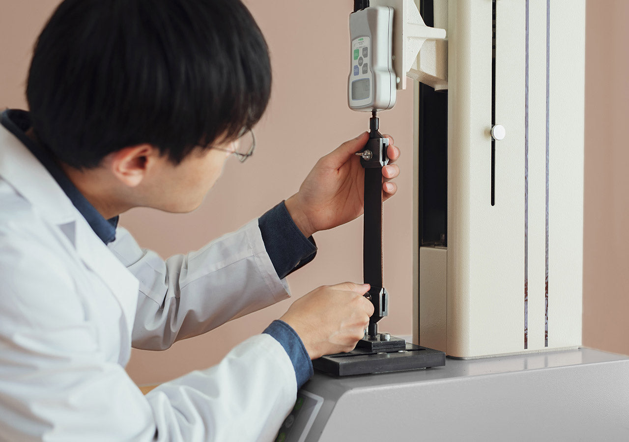 長く安心して使えるように。芯材や金具、フタの開け閉めなど、6年間の使用頻度を想定しながら、屈曲・耐光・摩擦試験など多岐にわたるテストを重ねています。