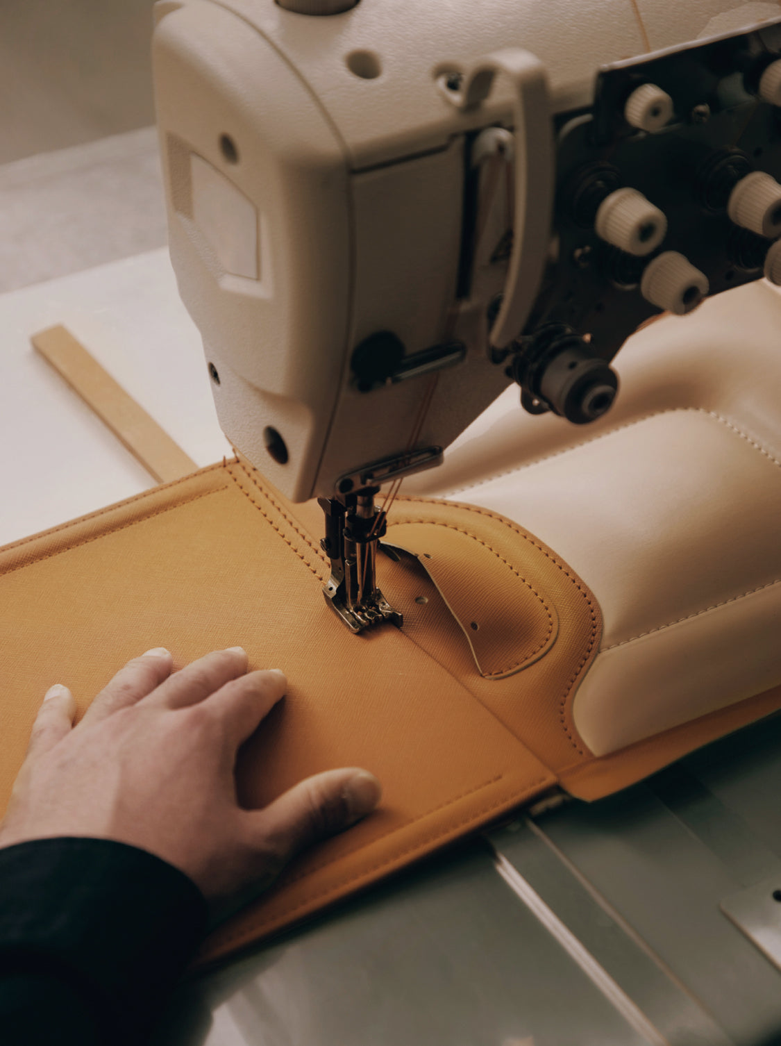 負荷のかかりやすい箇所は、ミシンに加えて手縫いで補強を。人の手でつくるからこそ、細部まで丈夫に美しく。一針ひと針を丁寧に。
