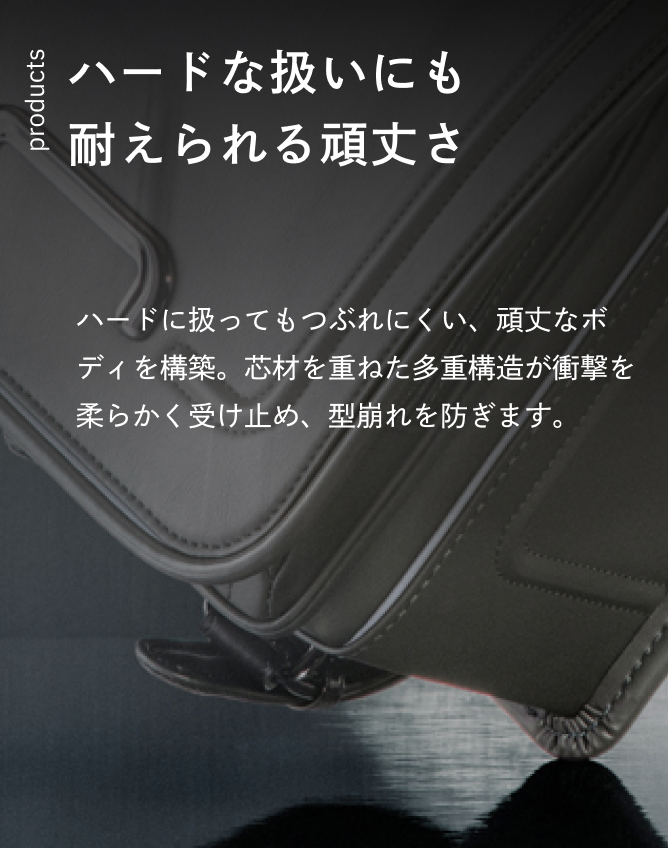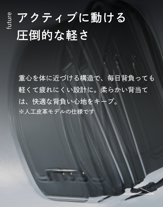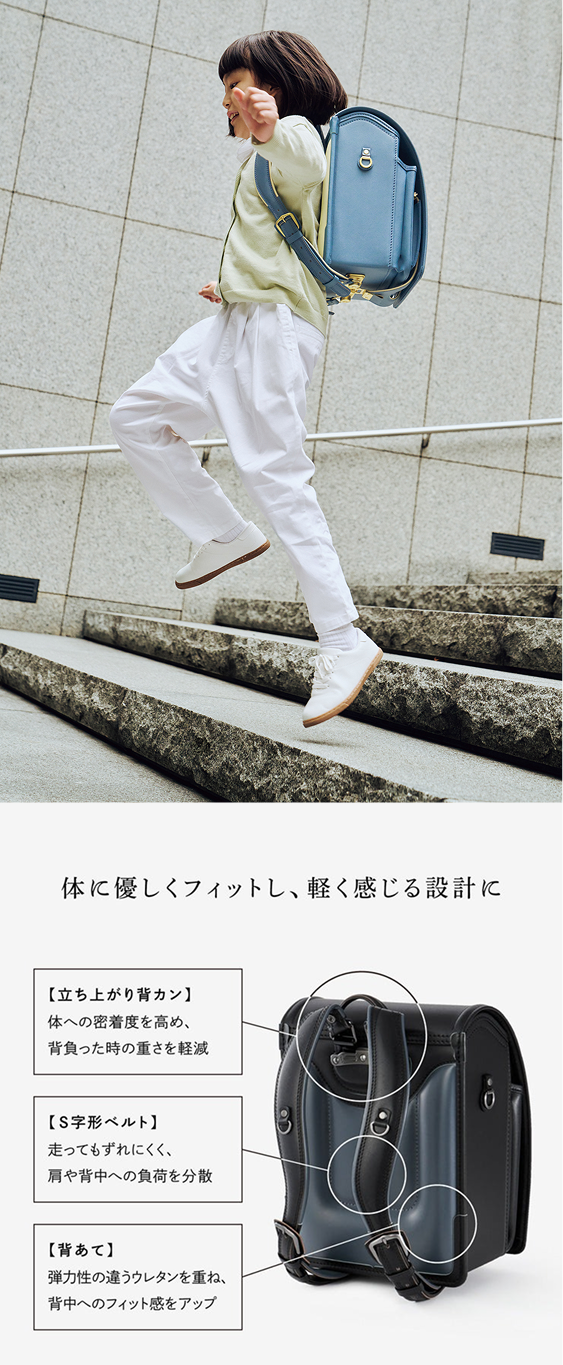 ランドセルを背負う姿を想像しやすい着用写真をはじめ、機能のこだわりやアフターサポート、販売情報まで幅広く掲載。