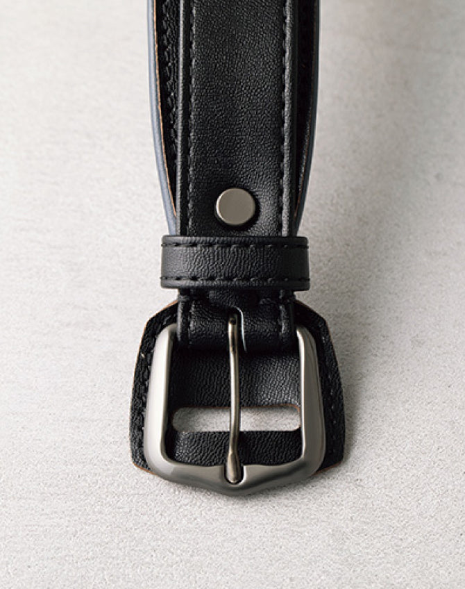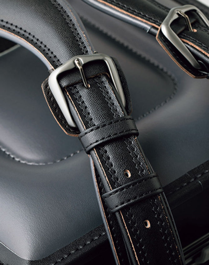 肩ベルトの金具(美錠)には、直接体に当たらないよう受けのパーツを装備。