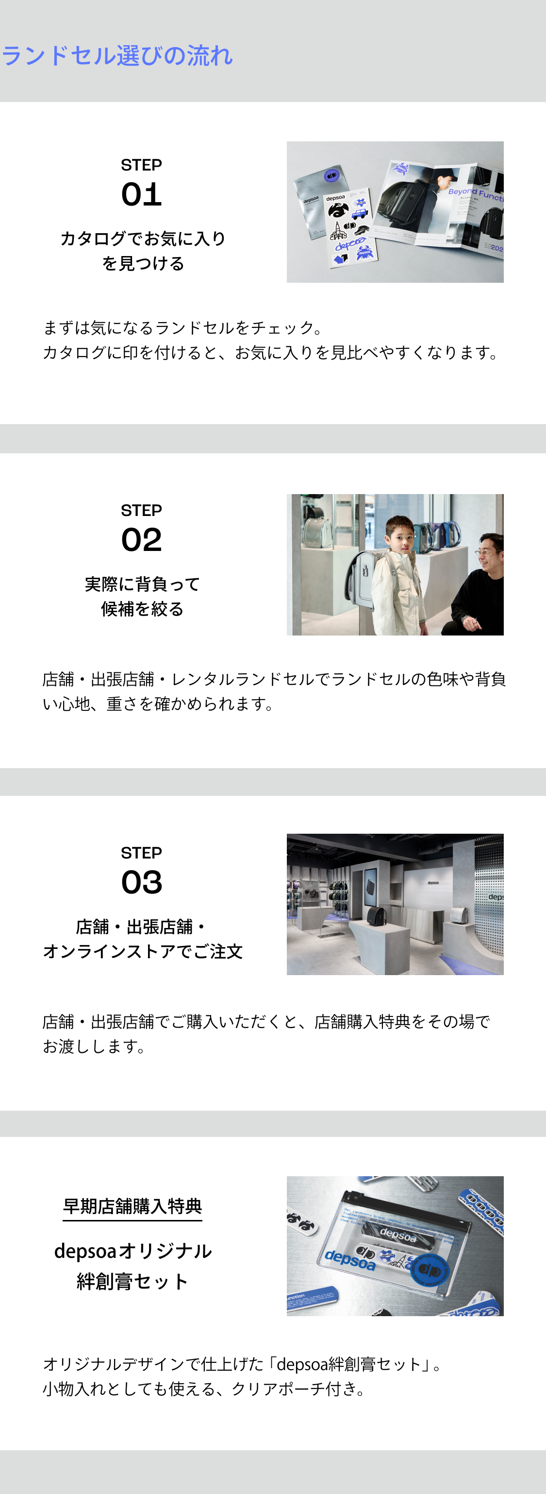 ※depsoaのランドセルは、土屋鞄のランドセルの直営店のほか、全国各地を巡る展示販売会「出張店舗」でも取り扱い。