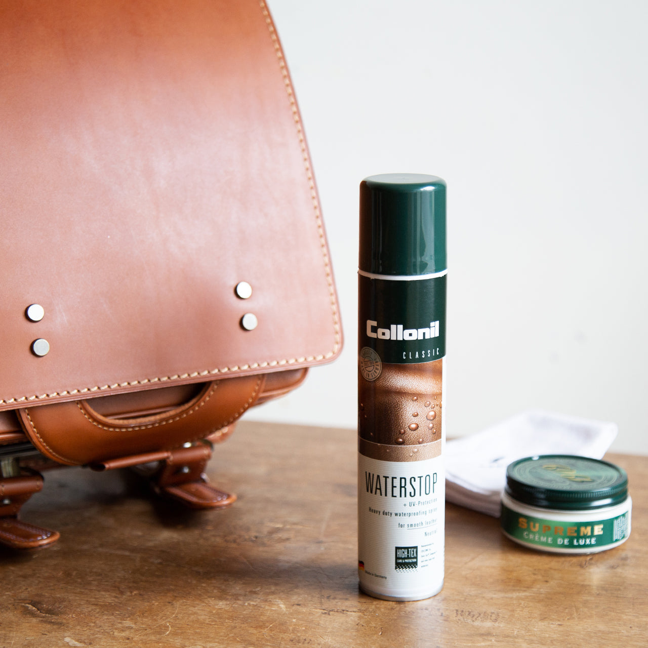 水濡れによるシミや水ぶくれ対策には防水スプレーで、乾燥によるひび割れ防止には保湿クリームでケアを。いずれも、ドイツのコロニル社の製品です。