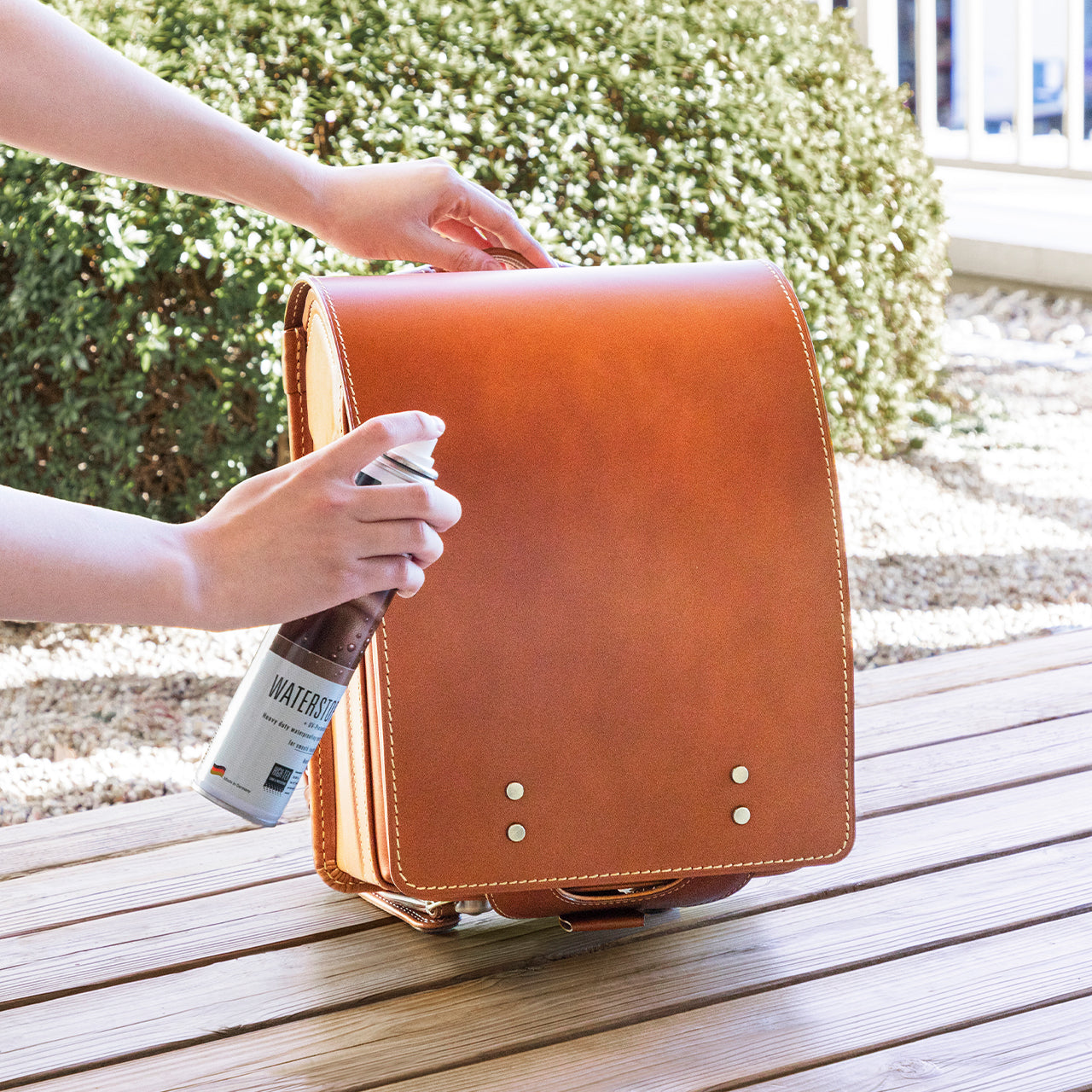 ランドセルから30cmほど離して、表面が軽く濡れる程度かけます。ケアは、1カ月に2~3回(梅雨時は1週間に1回ほど)を目安に。