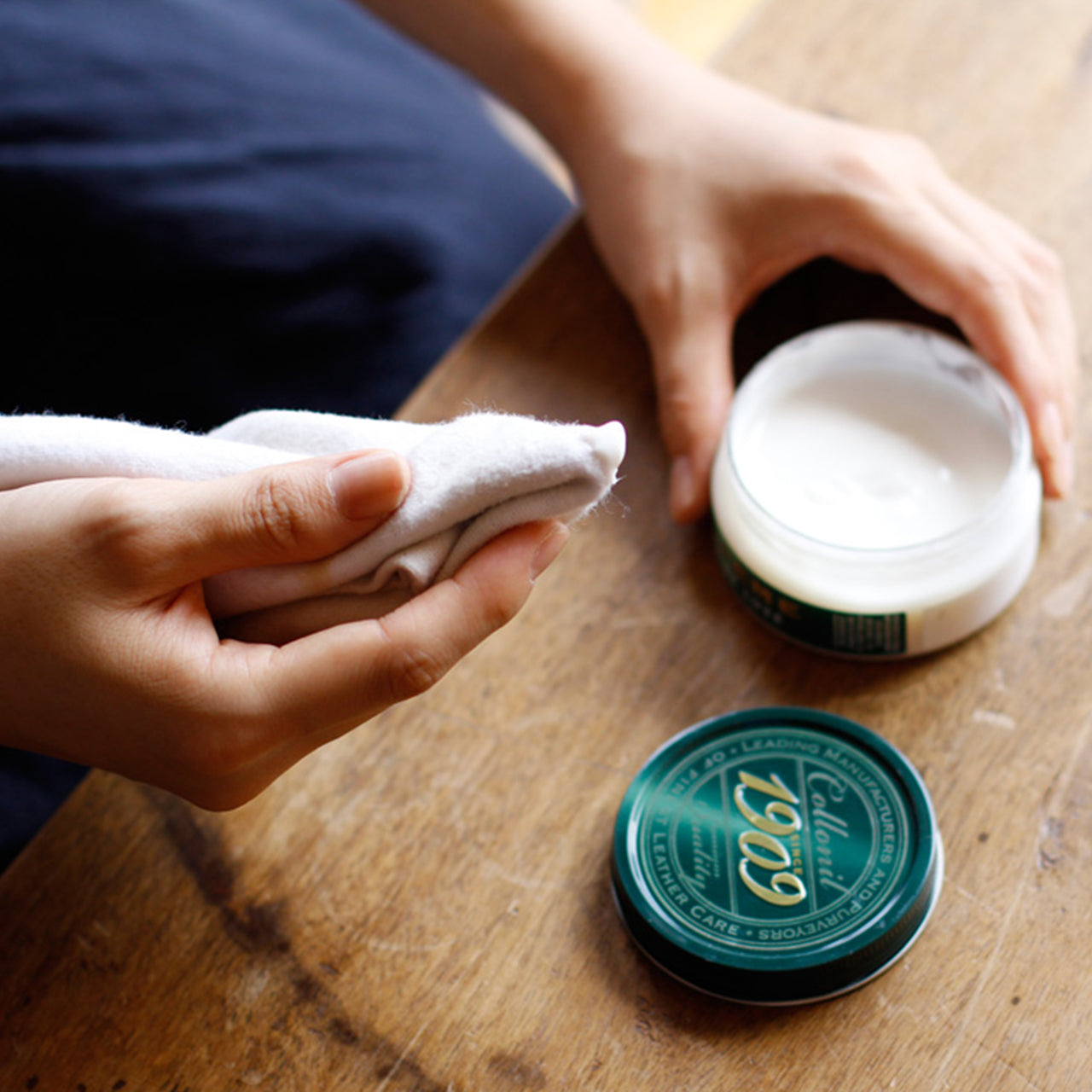 まず、汚れやほこりを取り除きます。クロスにクリームを少量つけ、数回に分けて薄く塗り広げます。ケアは、1~2カ月に1回を目安に。