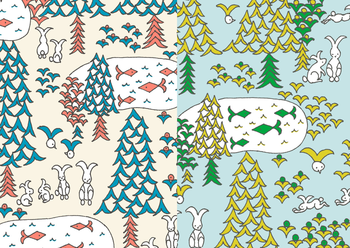 森の中に棲む生きものたち。鳥やウサギや魚、木々と草花はみんな同じ形の翼を持っています。鳥は翼に、ウサギは耳に、魚は尾ひれに、木々や草花は葉っぱとなって、翼は生きものたちの毎日を支えてくれています。この翼はみんなそれぞれの生命の中にある希望です。みんなそれぞれが持つ自分らしさを大切にして、希望とともに楽しく生活できるようにと願いを込めています。
