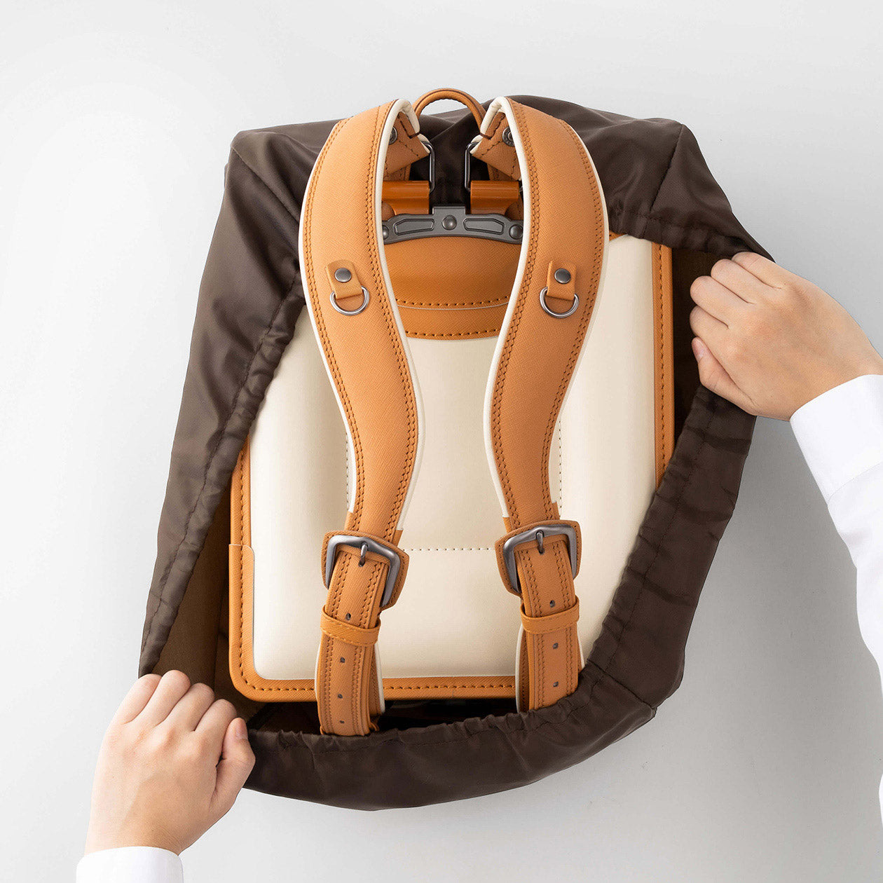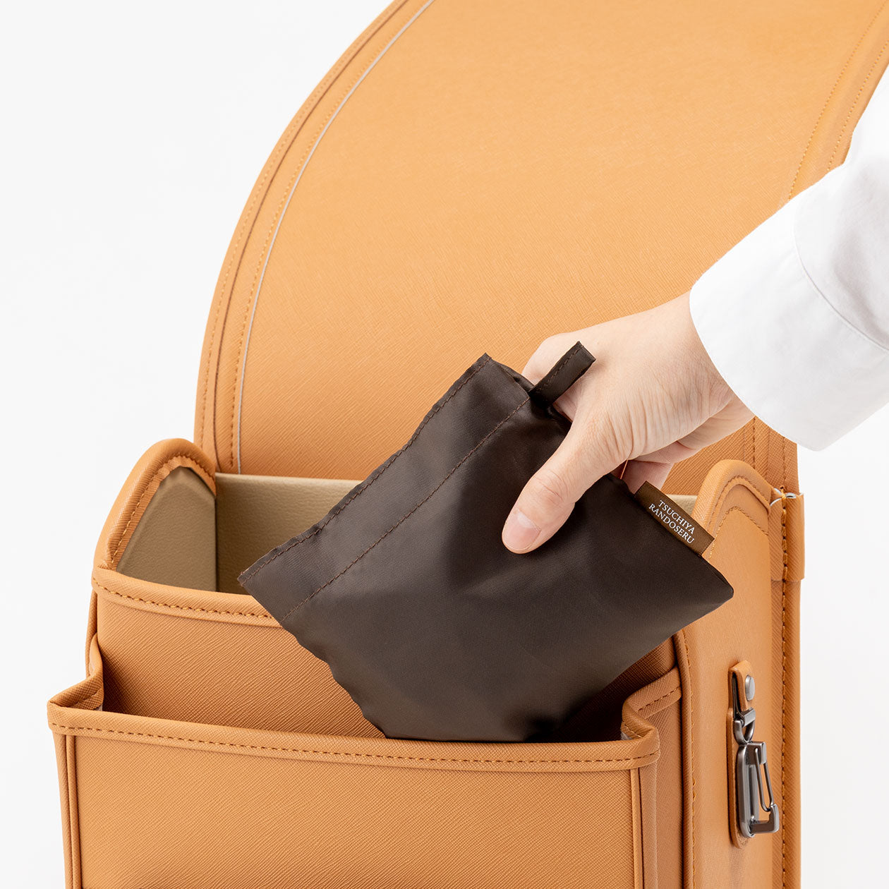 雨の日にランドセルを水濡れから守る、土屋鞄オリジナルの雨カバーです。ペットボトルから生まれたリサイクル素材を使い、高学年になっても似合うシックなデザインで仕立てました。