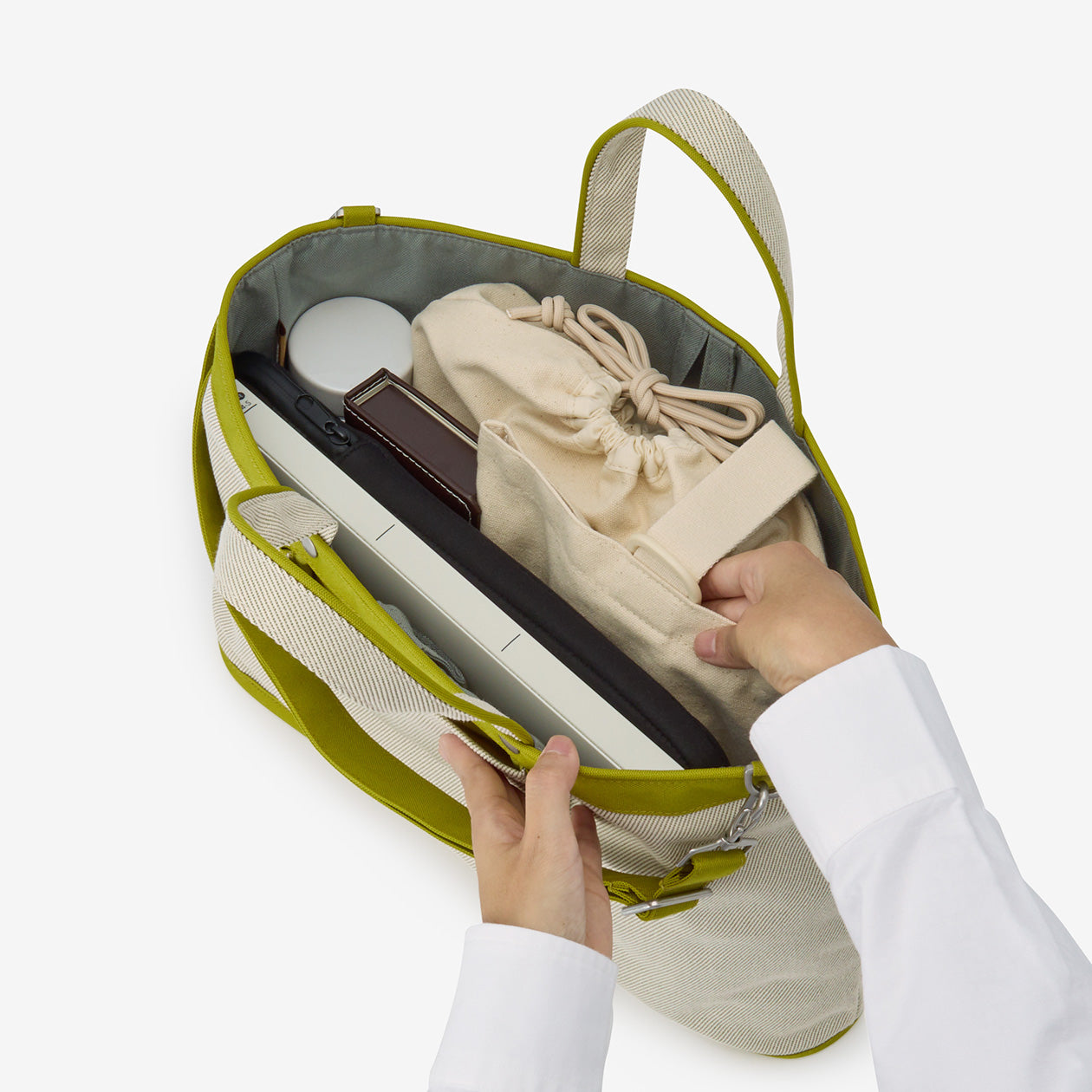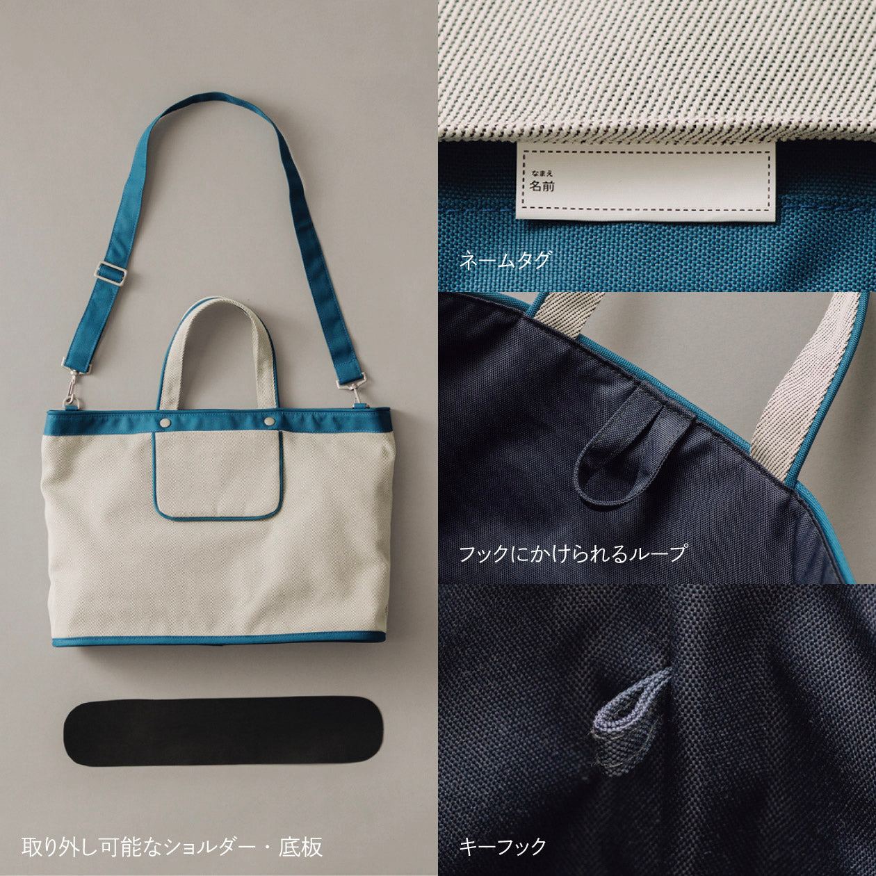 ネームタグやキーフック、バッグの形状を保つ底板など便利な機能付き。取り外しできるショルダーは、身長に合わせて長さを調整できます。